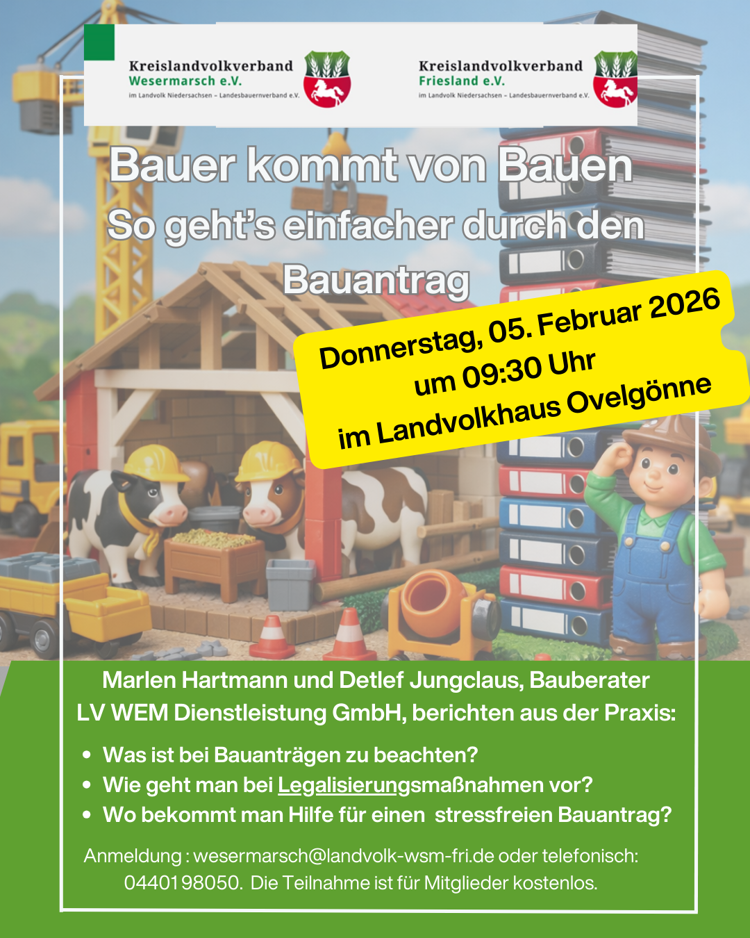 • Anmeldung : wesermarsch@landvolk-wsm-fri.de oder telefonisch: 04401 98050. Die Teilnahme ist für Mitglieder kostenlos.